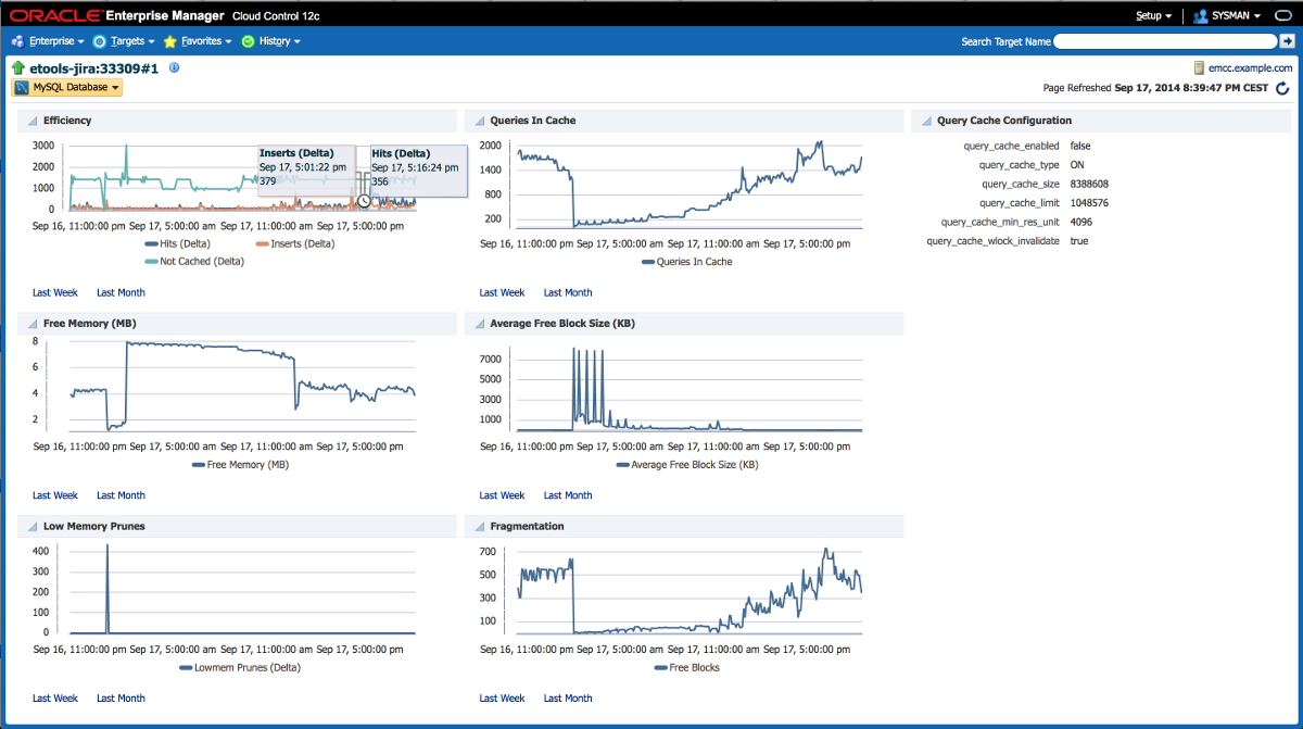 Oracle Enterprise Manager for MySQL collects more than 500 metrics covering various MySQL components. Using the Oracle Enterprise Manager compliance framework, standard rules are used to evaluate pre-defined thresholds and provide advice on how to change configuration parameters to bring your MySQL servers into compliance.